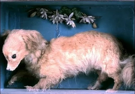 Your picture of a stuffed dog is a turnspit dog named whiskey. Also extinct, but originally bred in England to turn the spit in the kitchen. Extinct by 1900. Breed began dying out when mechanical turnspits began to be used in the 1850s.
