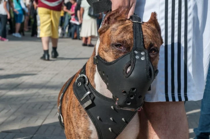 A dog wearing muzzle in public. Image Source: Tasteful Space